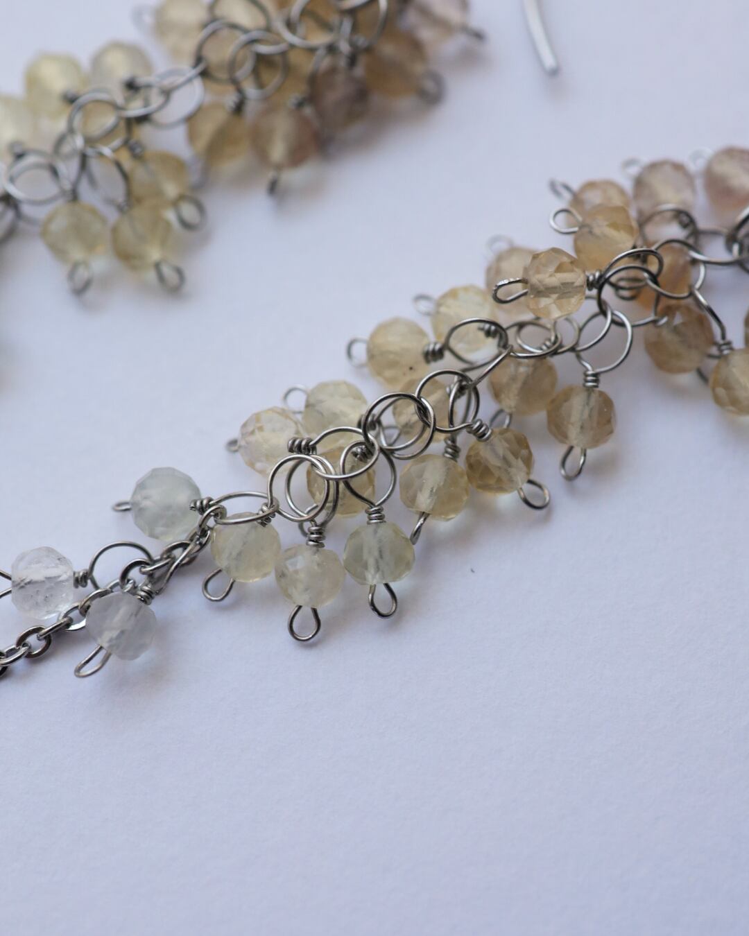 fusa-fusa(fluorite)は、パープル、ブルー、グリーンのフローライトをグラデーションになるようにつなぎ合わせた寒色系のイヤーアクセサリーですが、その際に使わなかったオレンジ・イエロー系の暖色フローライトを今回使用しニューアイテムとして誕生しました。
